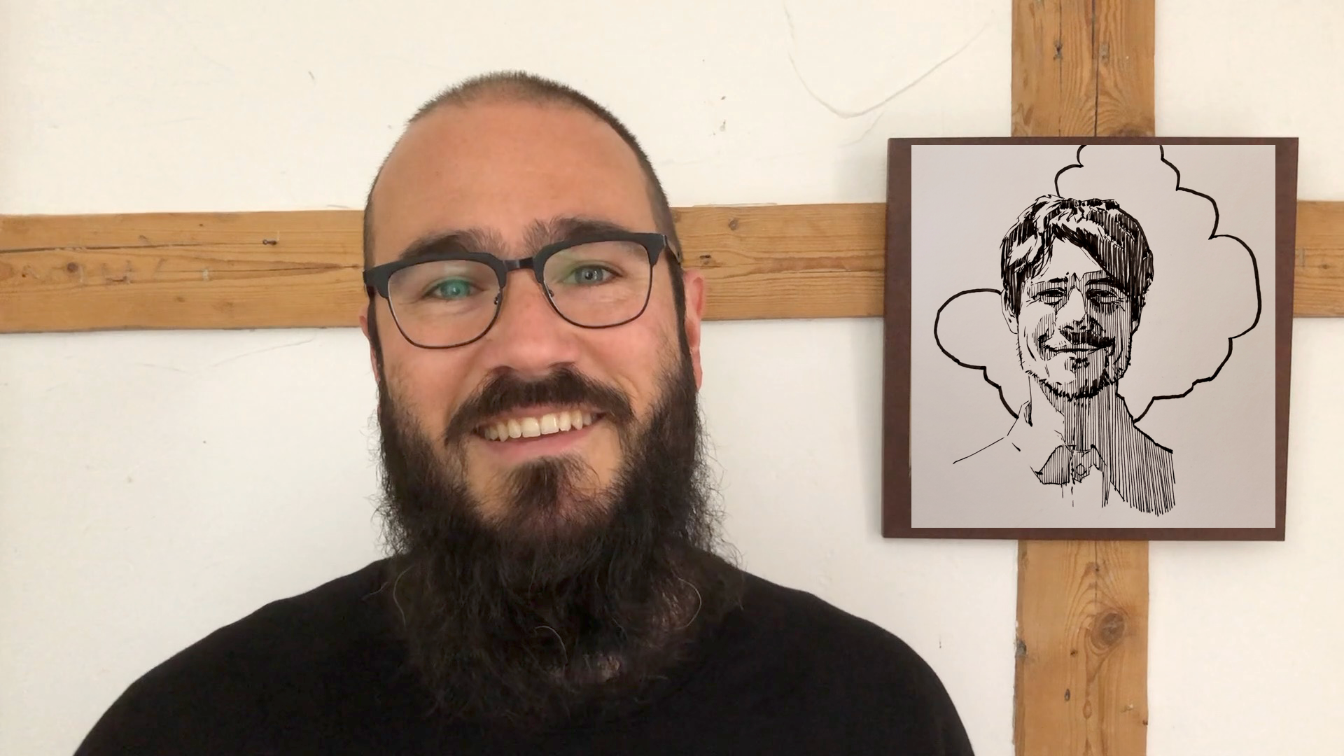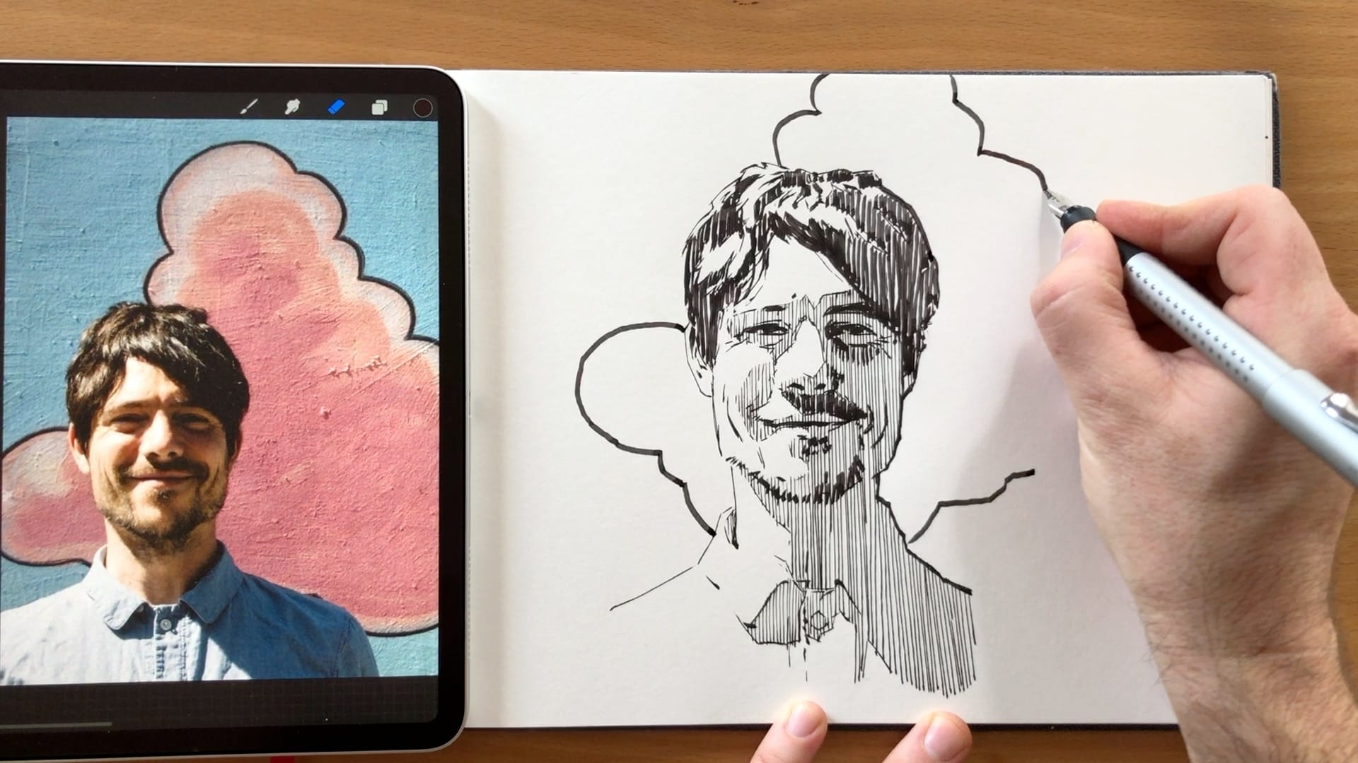 Draw an ink portrait with courageous lines and partly-cloudy whimsy.