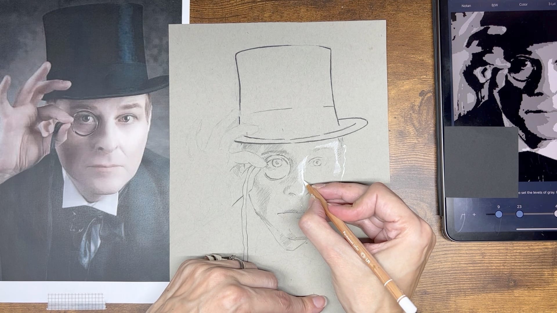 In this lesson (61 mins), artist Kirsten Britt draws a "dapper chap with a monocle" in black and white pencil.