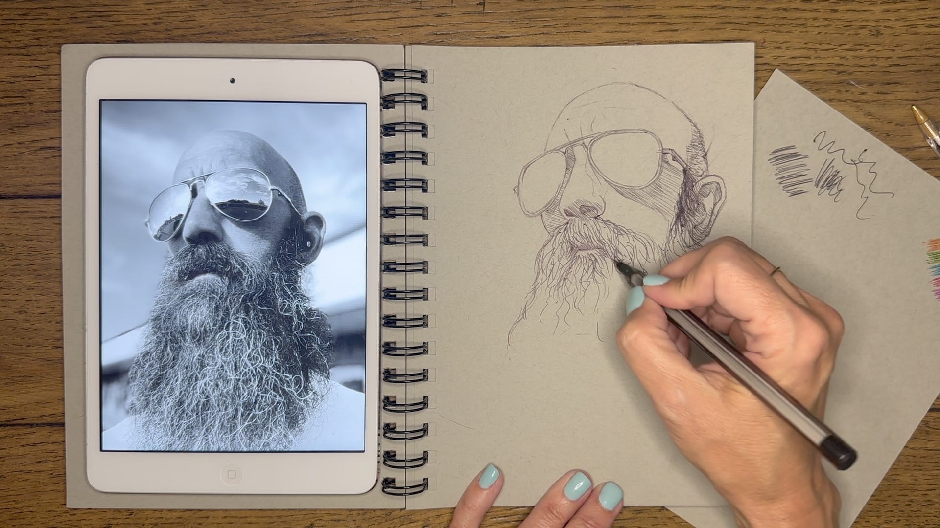 You’ll begin with a light pencil underdrawing to help place your subject's reflective sunglasses, then ink your way through his facial structure, expressive forehead lines, and iconic beard.
