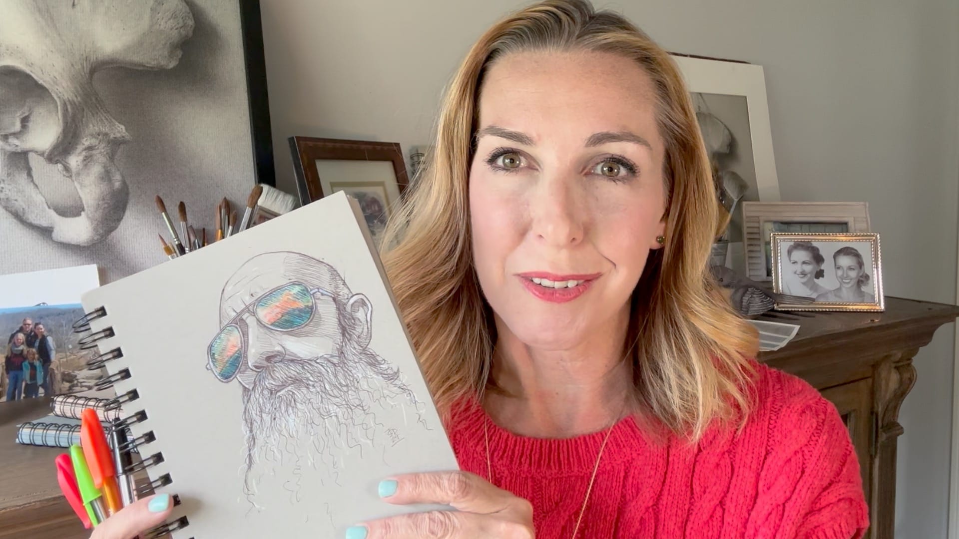 In a fun twist, she switches references mid-drawing to bring vivid color to Rick’s glasses—suggesting a reflective sunset and adding a whole new layer of personality.
