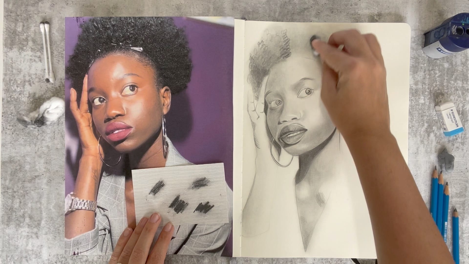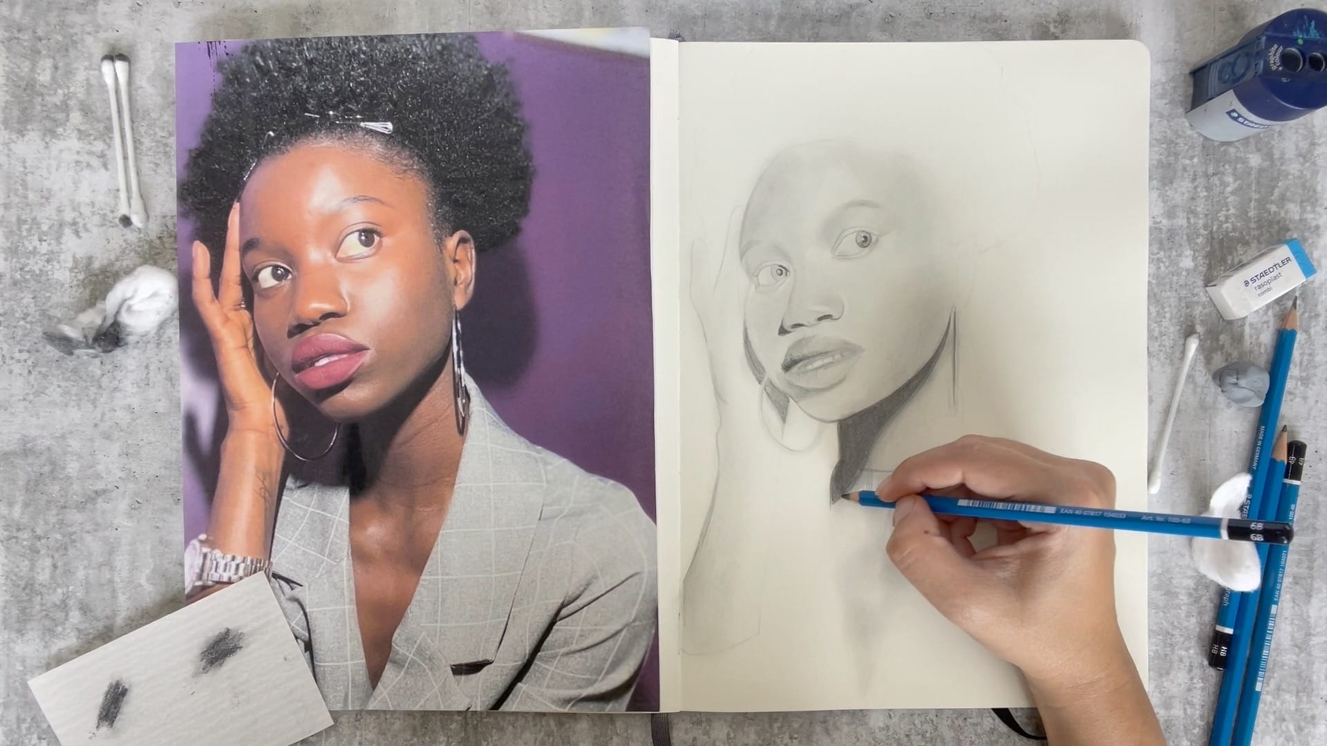 Then the lesson dives into technique. Shanay demonstrates how she builds tone fast and intuitively using everyday tools that make blending accessible and efficient. She lays down graphite quickly, blends early and often, and uses a kneaded eraser to “draw with light” at the final stage. Her method favors momentum over perfection, encouraging you to move with confidence, make bold marks, and refine the details later.