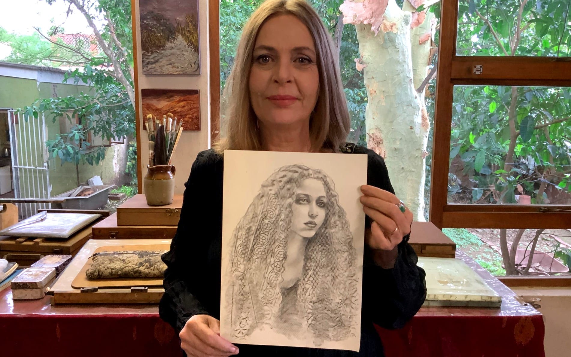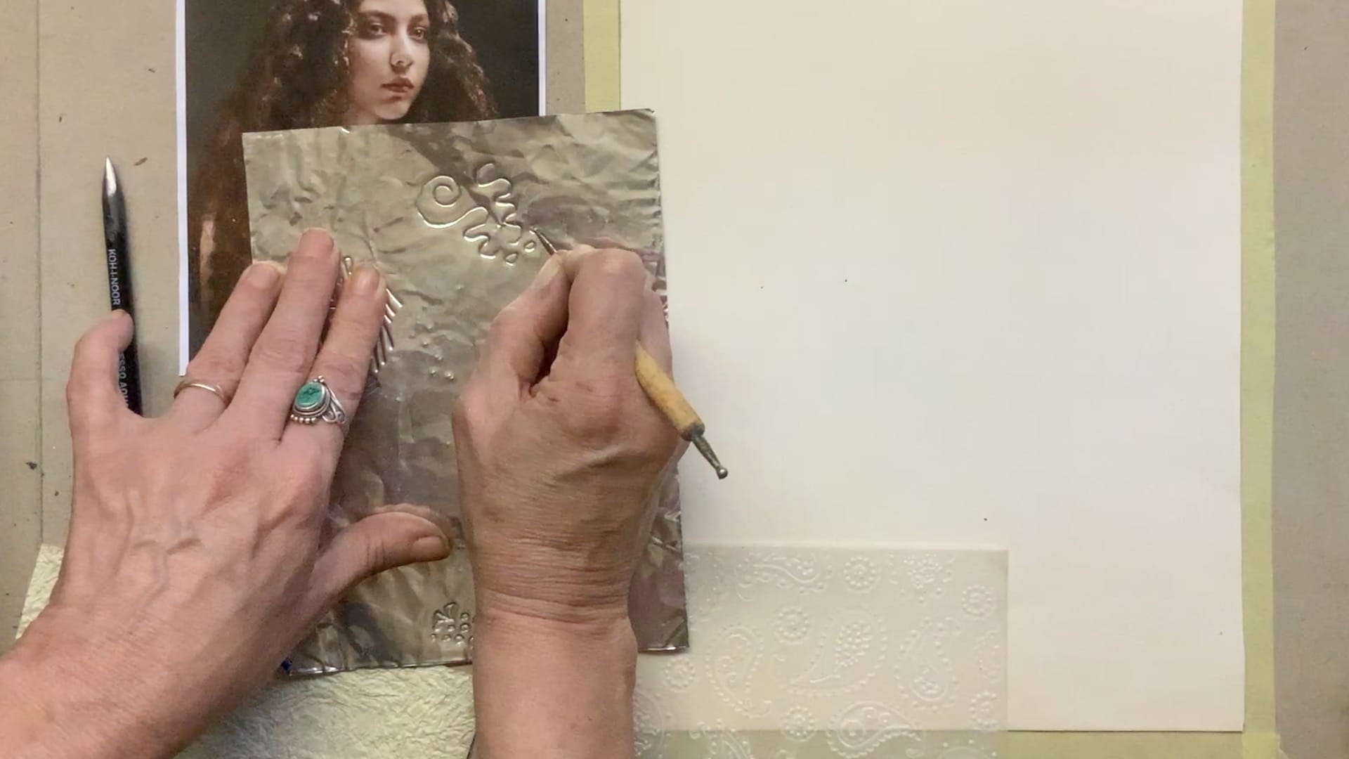 You’ll start with a sensitive graphite portrait, then turn to the hair, layering in texture using leaves, stencils, stamps, foil, or whatever you can find within reach. The result? A striking contrast between realism and abstraction, control and chance.