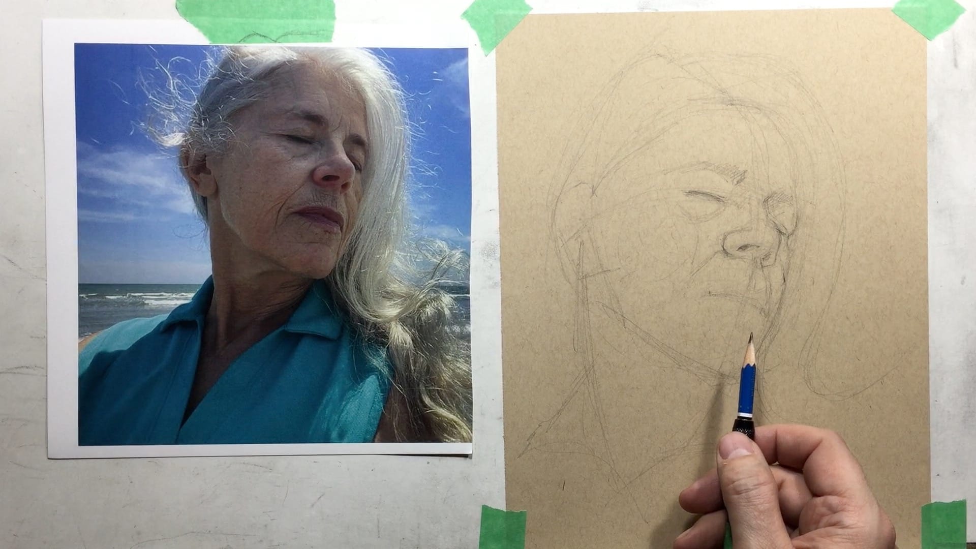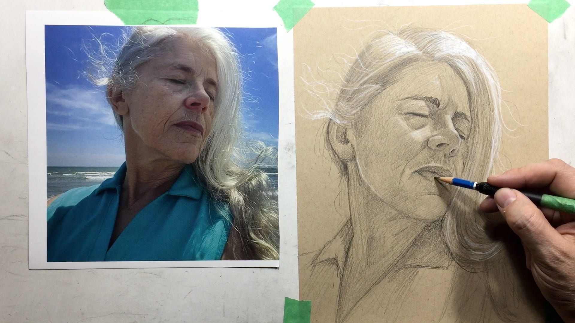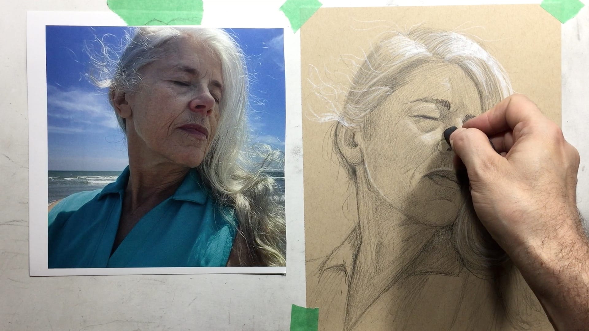 Throughout the lesson, Justin walks you through his thoughtful process from block-in to final details, showing you how to manage difficult angles, map facial structure when the usual cues are missing, and use toned paper strategically to create soft highlights and drama.
