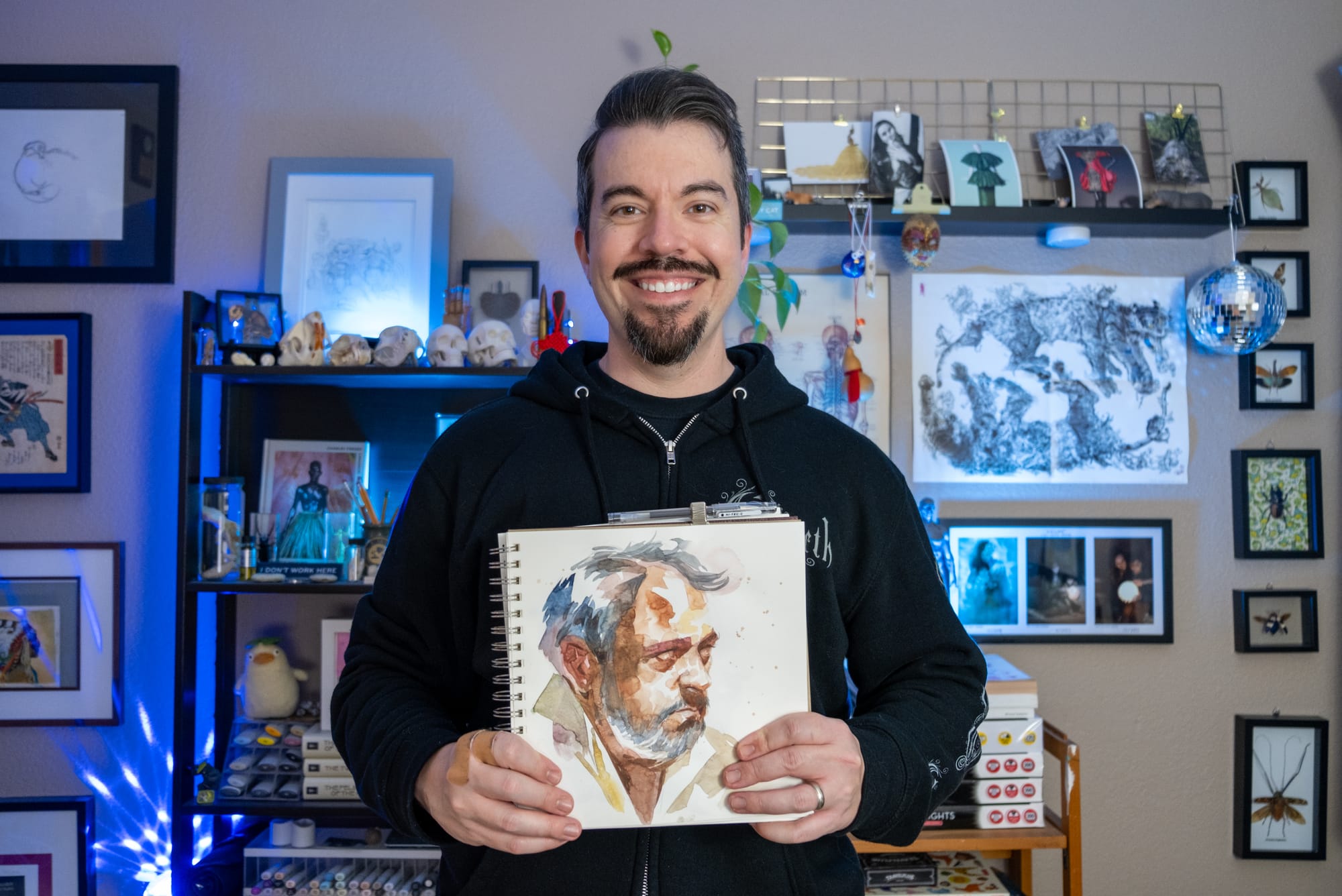 Working in his signature sketchbook style, David layers gesture, color, and bold shadow shapes to build a portrait that feels alive without obsessing over precision.