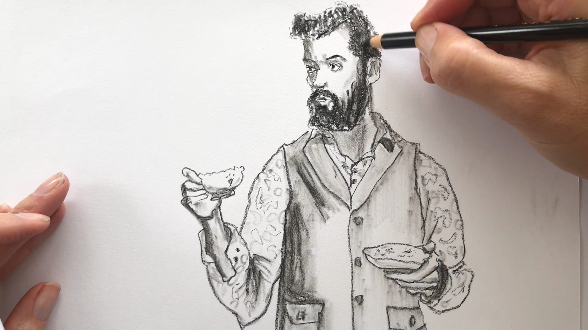Using charcoal and a blending stump, Chantal sketches a dynamic figure in motion, embracing imperfection and shifting her focus away from precision toward proportion and gesture.