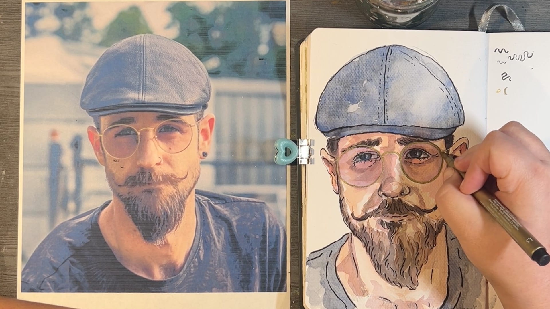 From there, Harmony switches to brush pens, metallic gel pens, and acrylic markers to sharpen features, carve out expressive facial hair, and add “pizzazz” in the form of gold glasses, jewelry, freckles, and a shimmering border that pulls the whole piece together.
