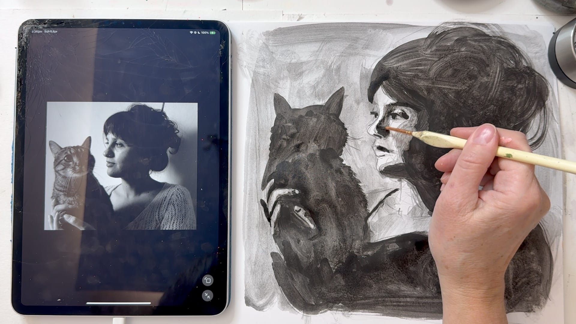 Rather than striving for a rigid, hyper-realistic likeness, Charlotte guides you through a process of discovery. You’ll begin with a five-minute continuous line drawing to map out the composition, a low-pressure way to find the flow of the face and the silhouette of a companion, like the cat featured in this piece.