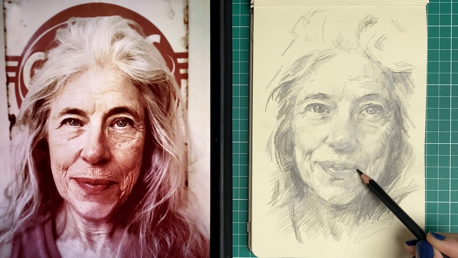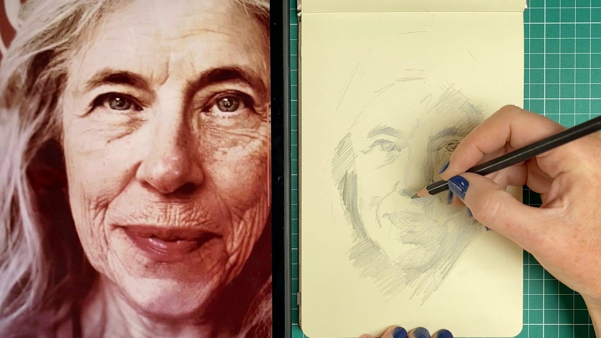 In this graphite lesson, Laura Cronin builds her portrait with care and curiosity, using a shifting array of pencil grades from 2B to 14B. Rather than chasing photorealism, she invites you to observe values in motion: to see the face not as a fixed object, but as a living surface of light, age, expression, and form.
