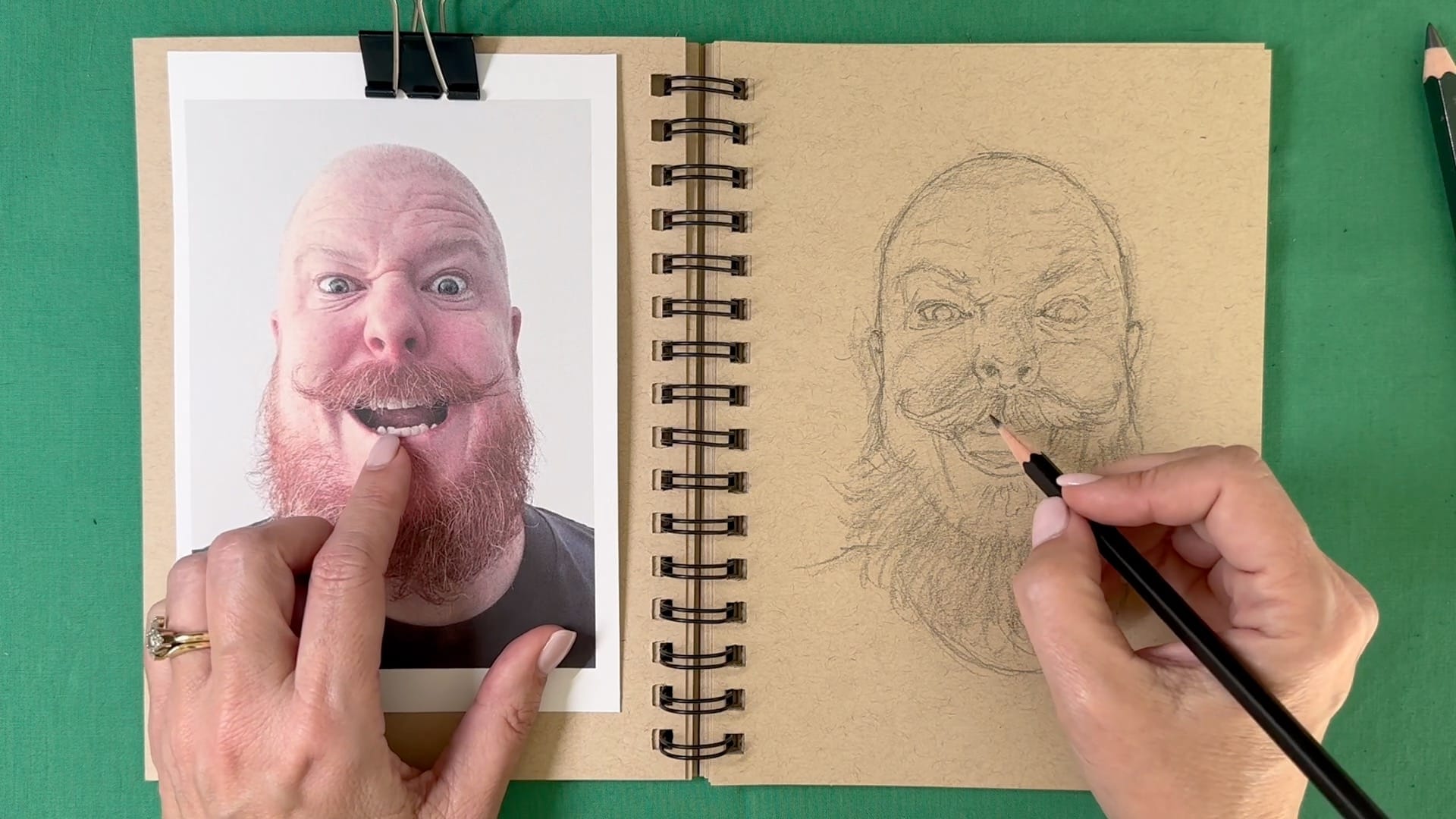 Working in graphite on toned paper, Tiffany tackles a boldly expressive reference: wide eyes, lifted brows, a dramatic up-tilt of the head, and a mustache that practically demands attention.